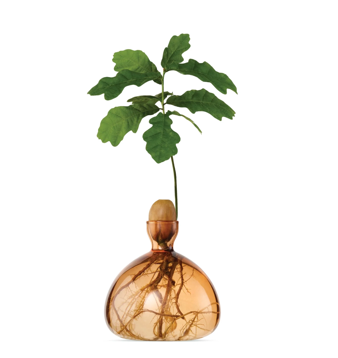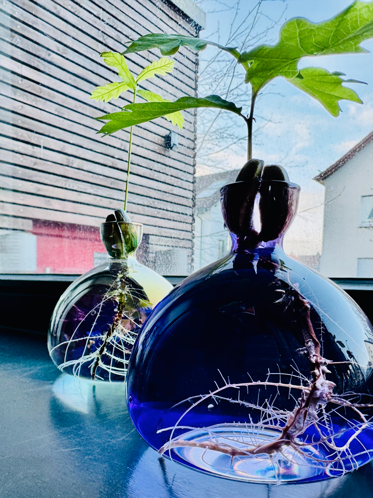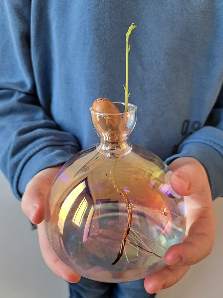Aus klarem, hochwertigem Borosilikatglas gefertigt, machen die Vasen den Keimungsprozess sichtbar. Die Avocado Vase trägt den Avocadokern über dem Wasser, während sich die Wurzeln frei entfalten können. Die Eichelvase bietet, demselben Prinzip folgend, einer Eichel den idealen Raum, um auszutreiben und Wurzeln zu schlagen.